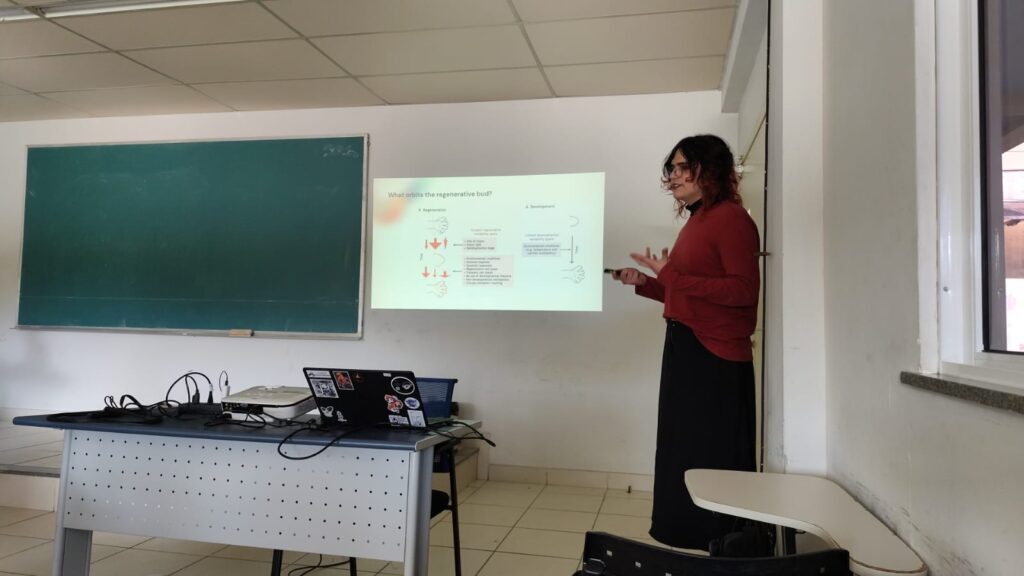 Fernanda Salce presents her research in the field of molecular biology and animal regeneration, focusing on epigenetic regulation during tissue regeneration. Using the beetle Tribolium castaneum as a model, she investigates the role of chromatin methylation and the pioneer transcription factor Zelda in the regeneration process.